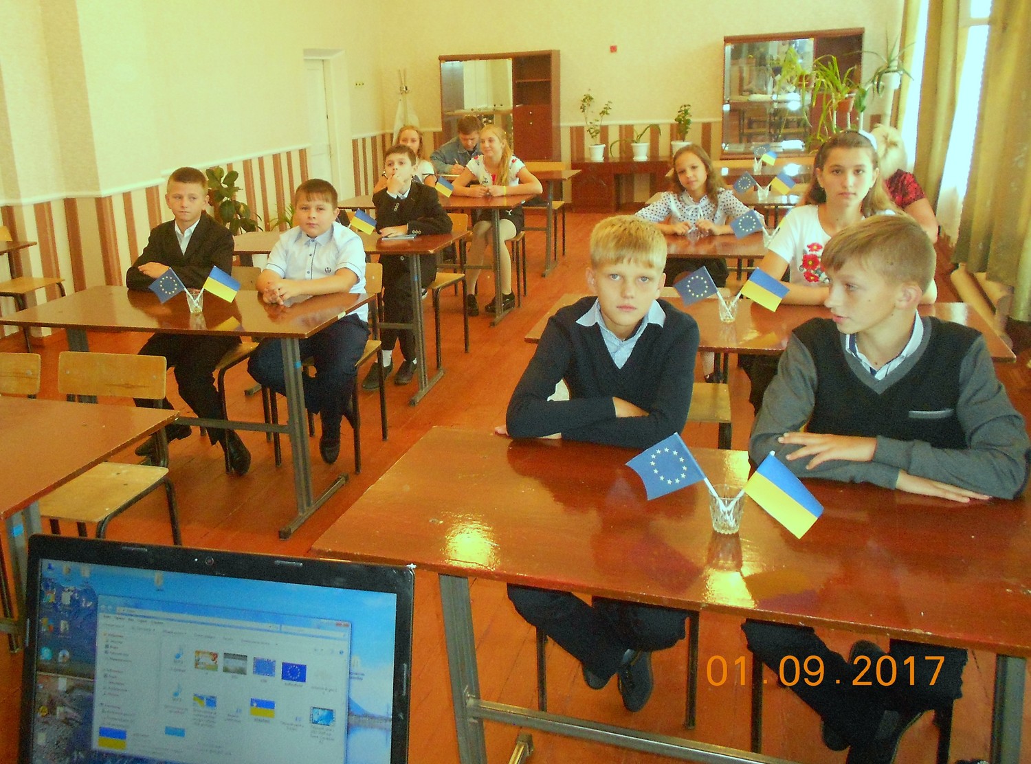 Розпочався новий навчальний рік, як завжди, з першого уроку. Теми уроків поділені на блоки: 1-4 класи – «Ми діти європейської держави» 5-7 класи – «Під синьо-жовтими прапорами України та Євросоюзу» 8-11 класи – «З Україною в серці»